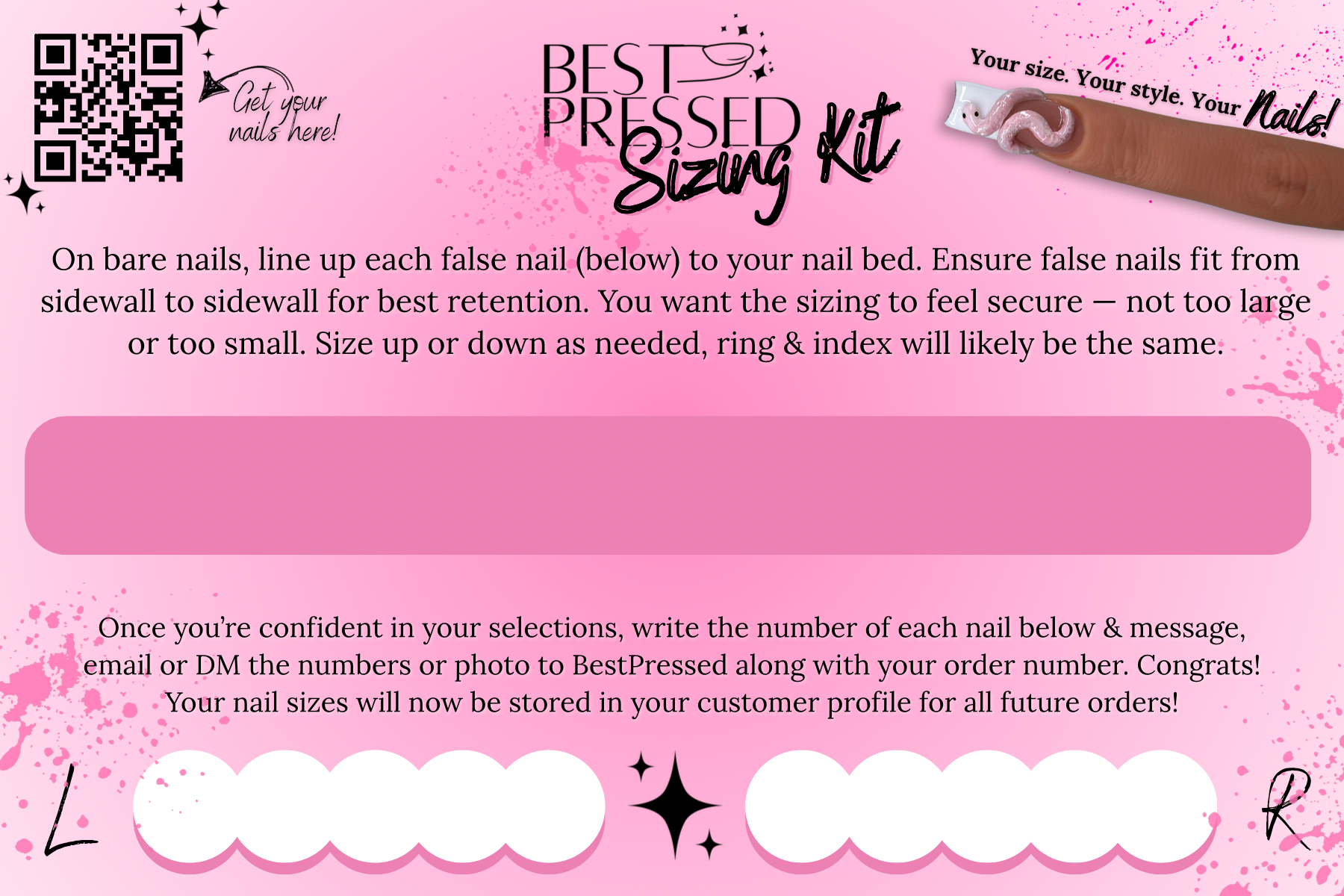 This is NOT required. The physical sizing kit is the most accurate method for those who want to ensure the best fit possible! Most recommended for those who are ordering more than one set or for nails for a special occasion. Please note the lengths received are not necessarily the exact length your nails will be as they aren’t sent out prior to filing & shaping.